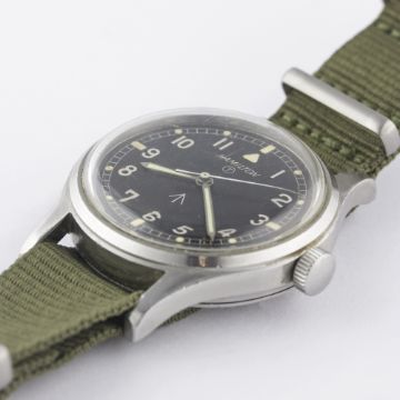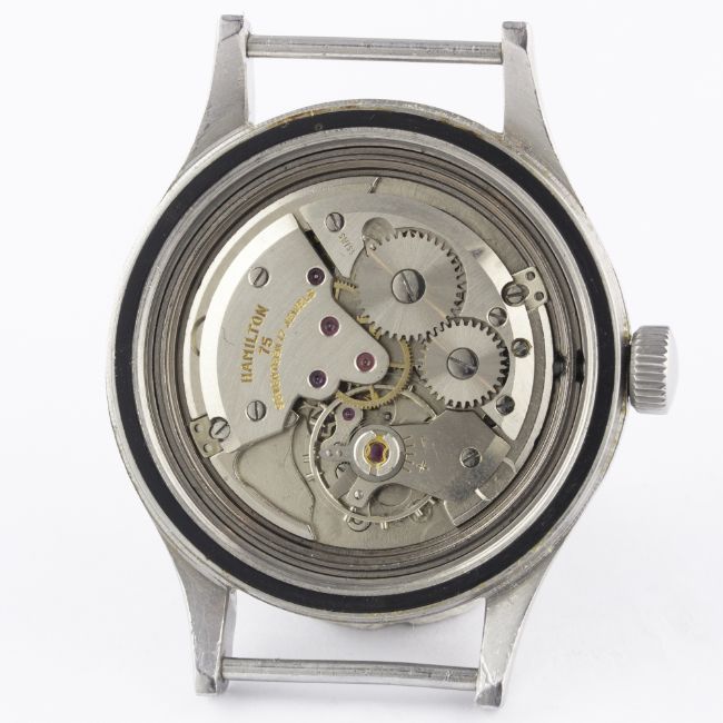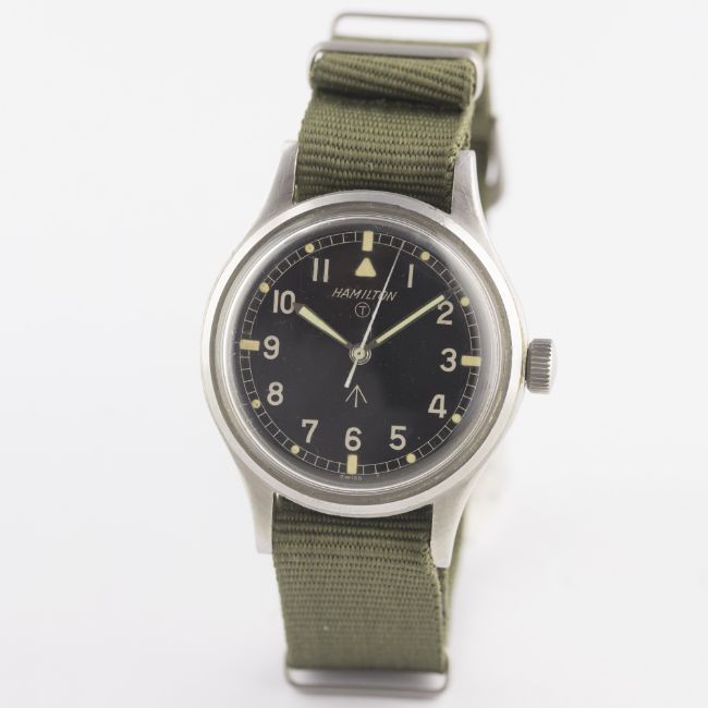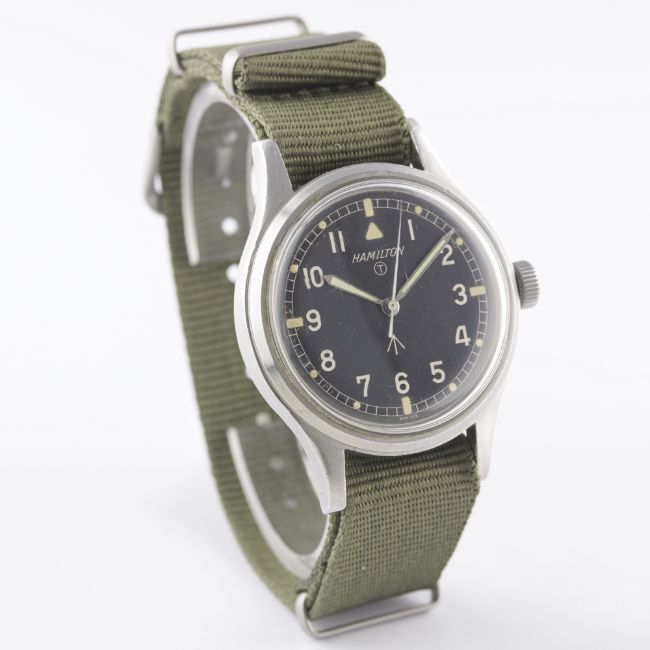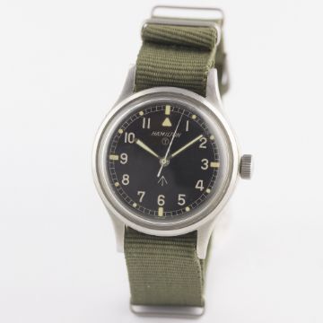 A GENTLEMAN'S STAINLESS STEEL BRITISH MILITARY HAMILTON RAF PILOTS WRIST WATCH CIRCA 1960sMovement: 17J, manual wind, cal. 75, signed Hamilton.Case: Diameter approx. 36mm, screw back, fixed bars, signed Hamilton Watch Co, issue markings ^ 6B-9101000 H 1910 M, dust cover.Strap: NATO. CONDITION REPORTDial: Original dial in excellent condition, showing some small signs of age.Movement: Working at present.Case: In very good condition, with some small scratches due to use.Strap/Bracelet: In excellent condition.