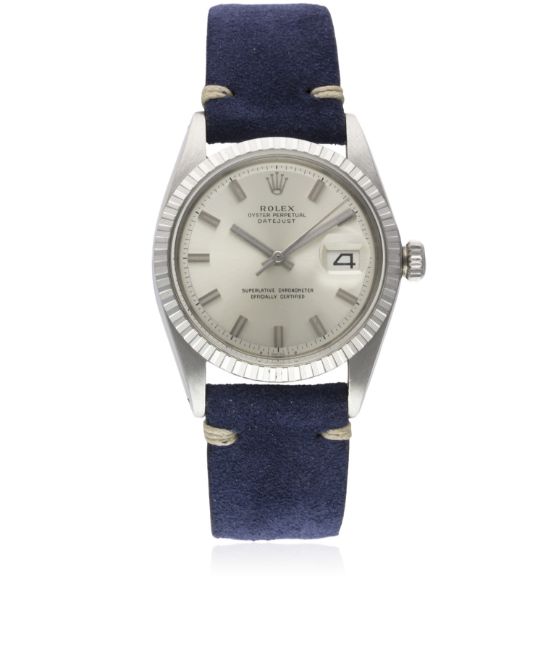 A GENTLEMAN'S STAINLESS STEEL ROLEX OYSTER PERPETUAL DATEJUST "WIDE BOY" WRIST WATCHCIRCA 1972, REF. 1603 WITH "SIGMA" DIALMovement: 26J, automatic chronometer, cal. 1570, signed Montres Rolex S.A., numbered.Case: Diameter approx. 36mm, Oyster case, signed Montres Rolex S.A., numbered, milled bezel, Rolex crown.Strap: Suede. CONDITION REPORTDial: Original dial in excellent condition.Movement: Working at present.Case: In excellent condition.Strap/Bracelet: In excellent condition.