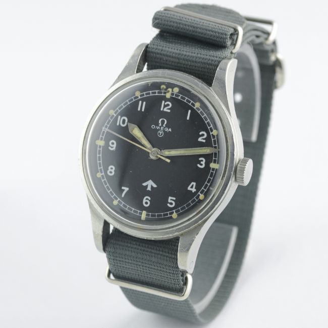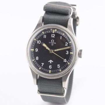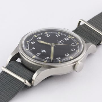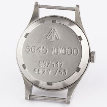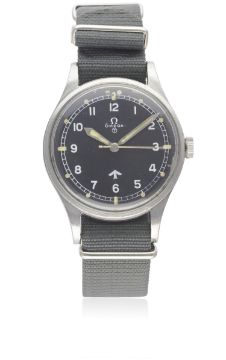 A GENTLEMAN'S STAINLESS STEEL BRITISH MILITARY OMEGA RAF PILOTS WRIST WATCH DATED 1953, REF. 2777-1 SCMovement: 17J, manual wind, cal. 283, signed Omega, numbered.Case: Diameter approx. 37mm, screw back, fixed bars, signed Omega Watch Co, issue markings ^ 6645 101000 6B/542 4627/53, dust cover.Strap: NATO. CONDITION REPORTDial: MOD dial in good condition, showing some small marks to the surface & some signs of age.Movement: Working at present.Case: In very good condition, with small scratches due to use.Strap/Bracelet: In excellent condition.