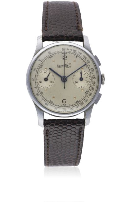 A GENTLEMAN'S CHROME PLATED EBERHARD & CO CHRONOGRAPH WRIST WATCH CIRCA 1940sMovement: Manual wind, signed Eberhard & Co.Case: Diameter approx. 33mm, steel snap back, signed Eberhard & Co, numbered.Strap: Leather.     CONDITION REPORTDial: Original dial in good condition, showing signs of age. Movement: Working at present. Case: In excellent condition, with some scratches & signs of wear due to general use. Strap/Bracelet: In good condition.