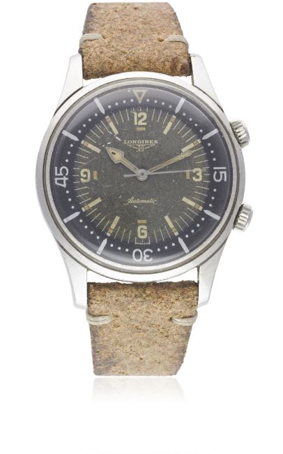 A VERY RARE GENTLEMAN'S STAINLESS STEEL LONGINES DIVERS WRIST WATCHCIRCA 1962, REF. 7042-3 WITH "TROPICAL" DIALMovement: 24J, automatic, cal. 19.AS, signed Longines, numbered.Case: Diameter approx. 42mm, screw back, signed Longines, numbered, spear diver embossed on case back, anti-slip crowns. Strap: Distressed leather. CONDITION REPORTDial: Original dial in very good "tropical" condition.Movement: Working at present.Case: In excellent condition, with some small scratches due to general use.Strap/Bracelet: New.