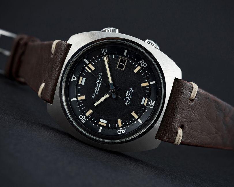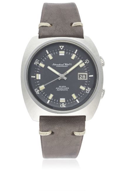 A RARE GENTLEMAN'S STAINLESS STEEL IWC AQUATIMER 30ATM AUTOMATIC DIVERS WRIST WATCH CIRCA 1968, REF. 816A Movement: Automatic, cal. 8541B, signed International Watch Co, numbered. Case: Width approx. 40mm, screw back, signed International Watch Co, numbered, submarine emblem embossed on case back, anti-slip crowns.Strap: Leather. CONDITION REPORTDial: Original dial in excellent condition.Movement: Working at present.Case: In excellent condition.Strap/Bracelet: In excellent condition.