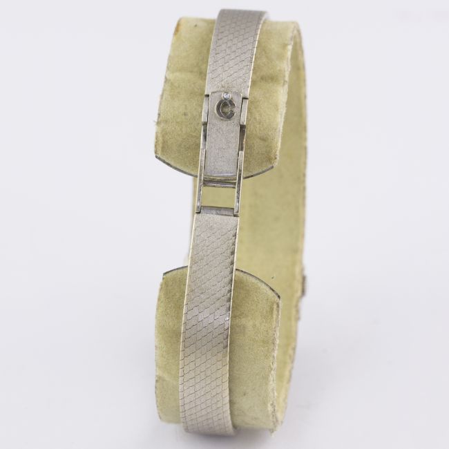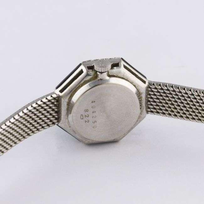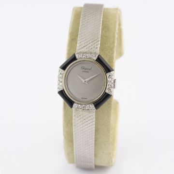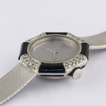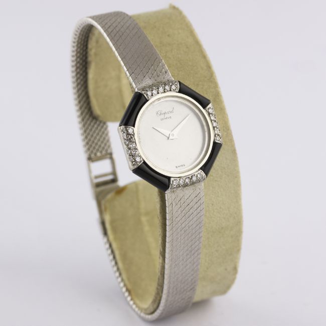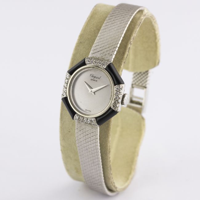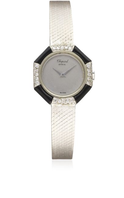 A LADIES 18K SOLID WHITE GOLD, DIAMOND & ONYX CHOPARD BRACELET WATCH CIRCA 1970s, REF. 822 Movement: Manual wind, signed Chopard.Case: Width approx. 22mm, original diamond & onyx set bezel, signed Chopard, numbered, 18k hallmarks, LUC crown.Bracelet: Original Chopard 18k solid white gold integral bracelet, total length approx. 170mm. CONDITION REPORTDial: Original dial in excellent condition.Movement: Working at present.Case: In excellent condition, with some light scratches due to general use.Strap/Bracelet: In very good condition.