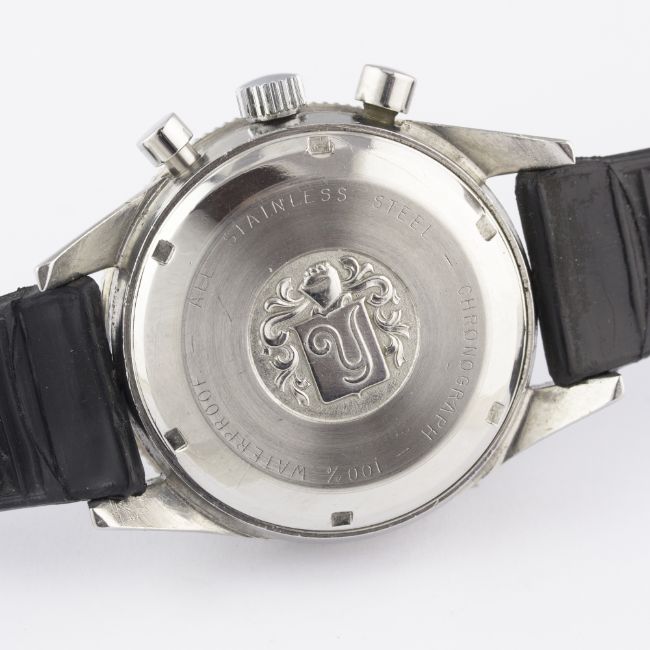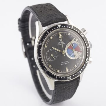 A RARE GENTLEMAN'S STAINLESS STEEL YEMA YACHTINGRAF PATENT PENDING CHRONOGRAPH WRIST WATCH CIRCA 1967Movement: 17J, manual wind, Valjoux cal. 7730.Case: Diameter approx. 39mm, screw back, ref. 9312, signed Yema with crest, signed Continental Time Co, numbered, 60 minute rotating bezel.Strap: Rubber Tropic. CONDITION REPORTDial: Original dial in excellent condition.Movement: Working at present.Case: In excellent condition, with some small scratches due to general use.Strap/Bracelet: In excellent condition.
