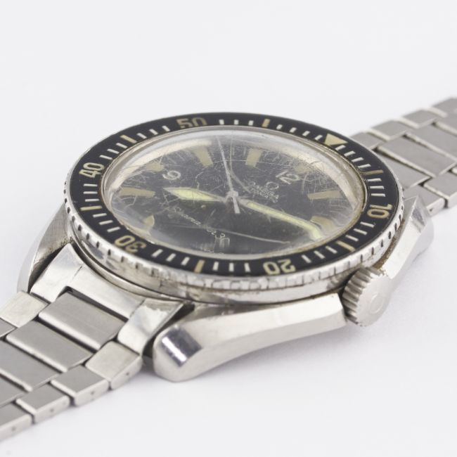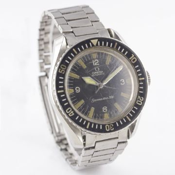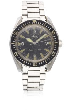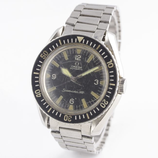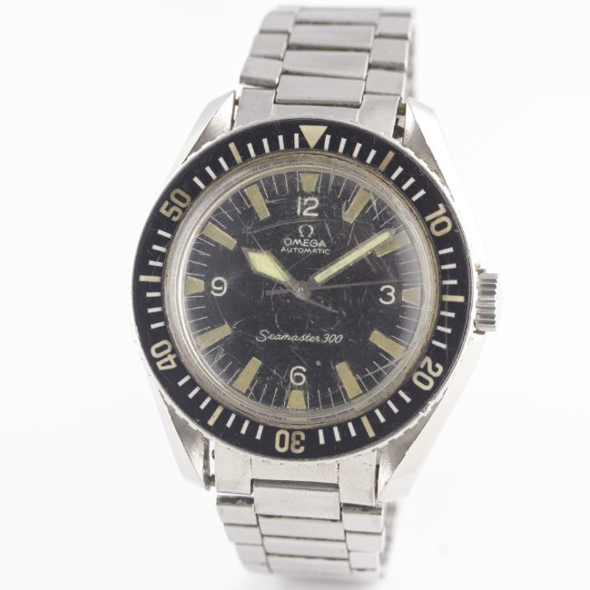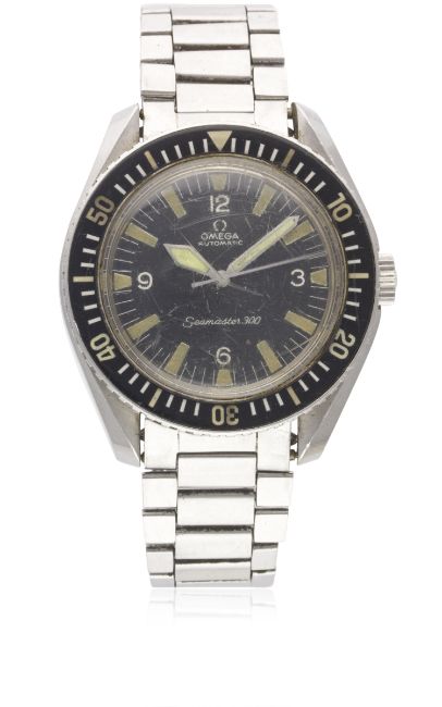 A RARE GENTLEMAN'S STAINLESS STEEL OMEGA SEAMASTER 300 BRACELET WATCH CIRCA 1967, REF. 165024 WITH "SWORD" HANDSMovement: 24J, automatic, cal. 552, signed Omega Watch Co, numbered. Case: Diameter approx. 42mm, screw back, signed Omega Watch Co, Seamaster emblem engraved on case back, 60 minute rotating bakelite bezel, Omega crown.Bracelet: Omega flat link bracelet, numbered (No.13) 1039/6, dated 4/67. CONDITION REPORTDial: Original dial in excellent condition.Movement: Working at present.Case: In excellent condition, with light scratches due to general use, plexiglass fairly scratched.Strap/Bracelet: In very good condition.