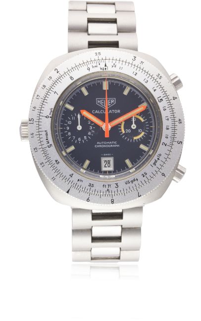 A GENTLEMAN'S STAINLESS STEEL HEUER CALCULATOR AUTOMATIC CHRONOGRAPH BRACELET WATCH CIRCA 1970sMovement: 17J, automatic, cal. 12, signed Heuer.Case: Width approx. 46mm, screw back, signed Heuer-Leonidas SA, rotating bezel to convert kilometres into nautical knots, Heuer crown & pushers.Bracelet: Stainless steel. CONDITION REPORTDial: Original dial in very good condition, showing some small signs of age.Movement: Working at present.Case: In very good condition.Strap/Bracelet: In very good condition.