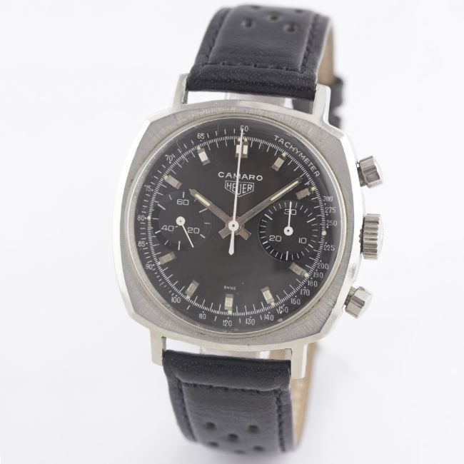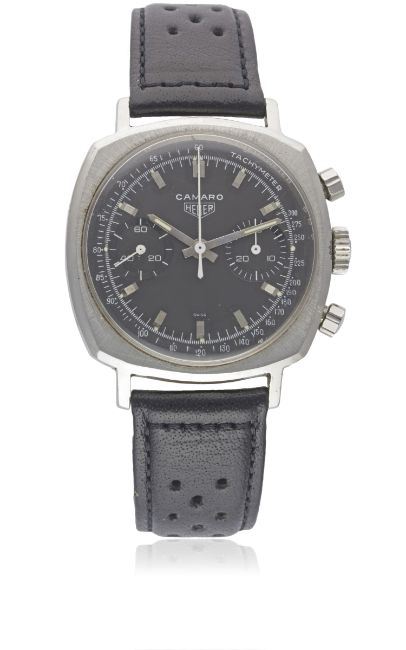 A RARE GENTLEMAN'S STAINLESS STEEL HEUER CAMARO CHRONOGRAPH WRIST WATCH CIRCA 1970, REF. 7743NT WITH BROWN "CHOCOLATE" DIALMovement: 17J, manual wind, Valjoux cal. 7730, signed Heuer Leonidas SA.Case: Width approx. 37mm, screw back, signed Heuer-Leonidas S.A., numbered, Heuer crown & pushers.Strap: Perforated leather. CONDITION REPORTDial: Original dial in very good condition, showing some small signs of age.Movement: Working at present.Case: In very good condition, with some small scratches due to general use.Strap/Bracelet: In excellent condition.