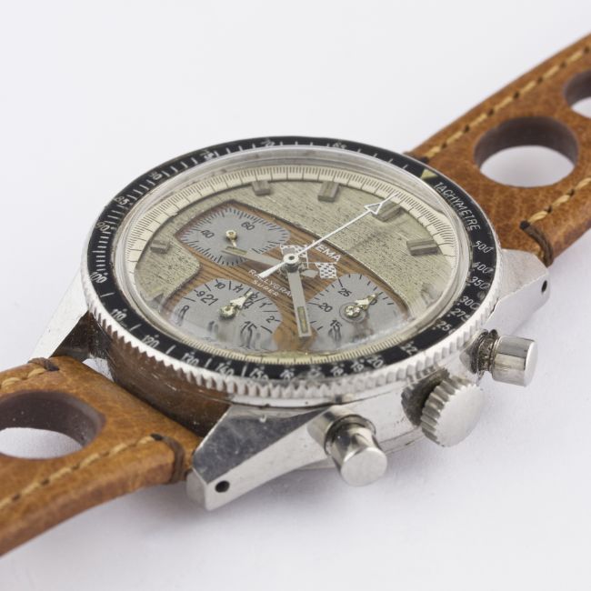 A RARE GENTLEMAN'S STAINLESS STEEL YEMA RALLYGRAF SUPER "FORMICA" CHRONOGRAPH WRIST WATCH CIRCA 1970Movement: 17J, manual wind, Valjoux cal. 7736.Case: Diameter approx. 39mm, screw back, ref. 93012, numbered, tachymetre bakelite bezel. Strap: Leather, racing style.  CONDITION REPORTDial: Original dial in good condition, showing some signs of age. Movement: Working at present. Case: In excellent condition, with some small scratches due to general use. Strap/Bracelet: In excellent condition.