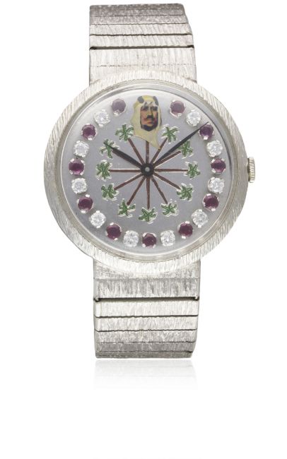 A RARE GENTLEMAN'S 18K SOLID WHITE GOLD GUBELIN BRACELET WATCH CIRCA 1970s, WITH SOLID GOLD RUBY & DIAMOND SET DIAL, DEPICTING KING SAUD BIN ABDULAZIZ AL SAUD OF SAUDI ARABIAMovement: 21J, manual wind, signed Gubelin, numbered.Case: Diameter approx. 33mm, bark effect, signed Gubelin, numbered, 18k hallmarks.Bracelet: Original 18k solid white gold integral bark effect bracelet, total length approx. 165mm.    CONDITION REPORTDial: Original dial in excellent condition. Movement: Working at present. Case: In excellent condition, with some light scratches due to general use. Strap/Bracelet: In good condition, a few stretch links