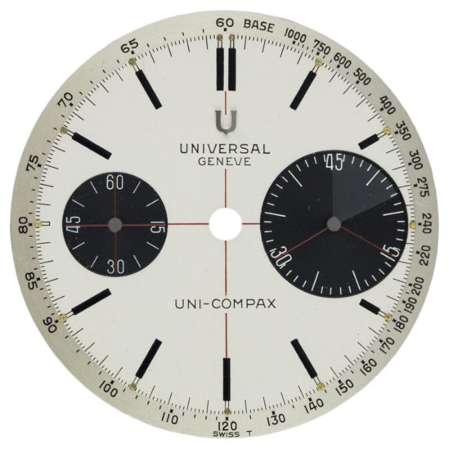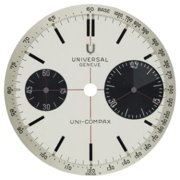 A VERY RARE "NOS" UNIVERSAL GENEVE UNI-COMPAX "BIG EYE" CHRONOGRAPH DIAL CIRCA 1960s, FOR REF. 884100/02 Dial: Signed Singer on back. CONDITION REPORTDial: Original dial in excellent condition.The dial is in new old stock condition.