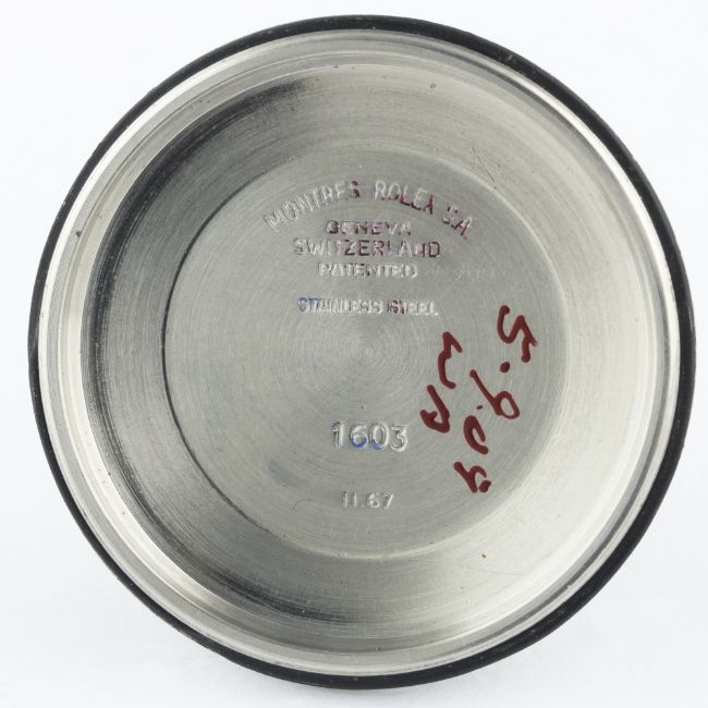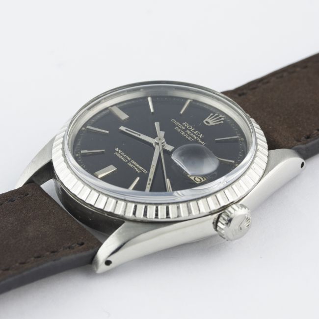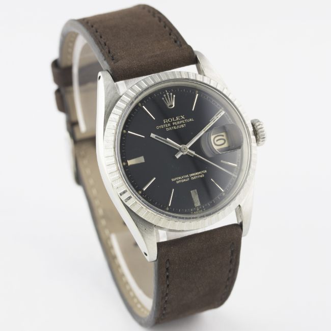 A RARE GENTLEMAN'S STAINLESS STEEL ROLEX OYSTER PERPETUAL DATEJUST WRIST WATCHCIRCA 1967, REF. 1603 WITH GLOSS BLACK DIALMovement: 26J, automatic chronometer, cal. 1560, signed Montres Rolex S.A., numbered.Case: Diameter approx. 36mm, Oyster case, signed Montres Rolex S.A., dated II.67, numbered, milled bezel, Rolex crown.Strap: Suede. CONDITION REPORTDial: Original dial in excellent condition, showing some small signs of age.Movement: Working at present.Case: In excellent condition, with some light scratches due to general use.Strap/Bracelet: In excellent condition.