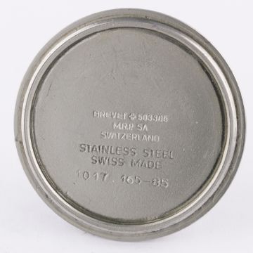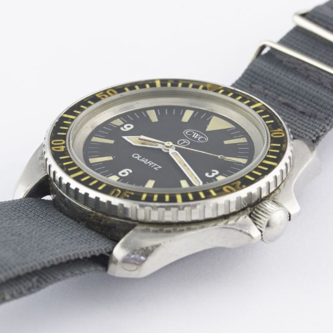 A RARE GENTLEMAN'S STAINLESS STEEL BRITISH MILITARY CWC QUARTZ ROYAL NAVY DIVERS WRIST WATCH DATED 1985Movement: Quartz.Case: Diameter approx. 42mm, screw back, fixed bars, signed M.R.P. SA, numbered, issue markings 0552/6645-99-7573314 ^ 543/85, 60 minute rotating bakelite bezel, crown guards, screw-down crown.Strap: NATO. CONDITION REPORTDial: Original dial in very good condition, showing some signs of age.Movement: Working at present.Case: In fair condition, with corrosion inbetween the lugs.Strap/Bracelet: In good condition.