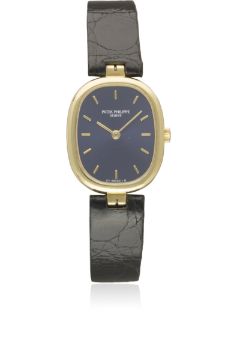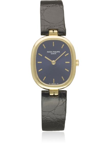 A LADIES 18K SOLID GOLD PATEK PHILIPPE ELLIPSE WRIST WATCH CIRCA 1990s Movement: Quartz, signed Patek Philippe.Case: Approx. 24mm by 20mm, signed Patek Philippe, numbered, 18k hallmarks, original crown.Strap: Patek Phillipe leather strap & 18k solid gold pin buckle. CONDITION REPORTDial: Original dial in excellent condition.Movement: Working at present.Case: In excellent condition.Strap/Bracelet: In excellent condition.
