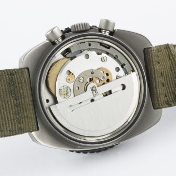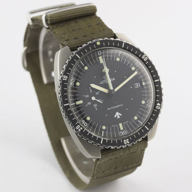 AN EXTREMELY RARE GENTLEMAN'S STAINLESS STEEL ROYAL AUSTRALIAN NAVY LEMANIA AUTOMATIC PILOTS CHRONOGRAPH WRIST WATCH DATED 1981Movement: Automatic, cal. 5100, numbered.Case: Width approx. 41mm, screw back, numbered, issue markings 11015-2-59 1981 6645-66-071-8382 ^, 60 minute rotating bezel. Strap: Textile. CONDITION REPORTDial: Original dial in excellent condition.Movement: Working at present.Case: In excellent condition, matt finish to case middle, crown & pushers, some light scratches due to use.Strap/Bracelet: In good condition.