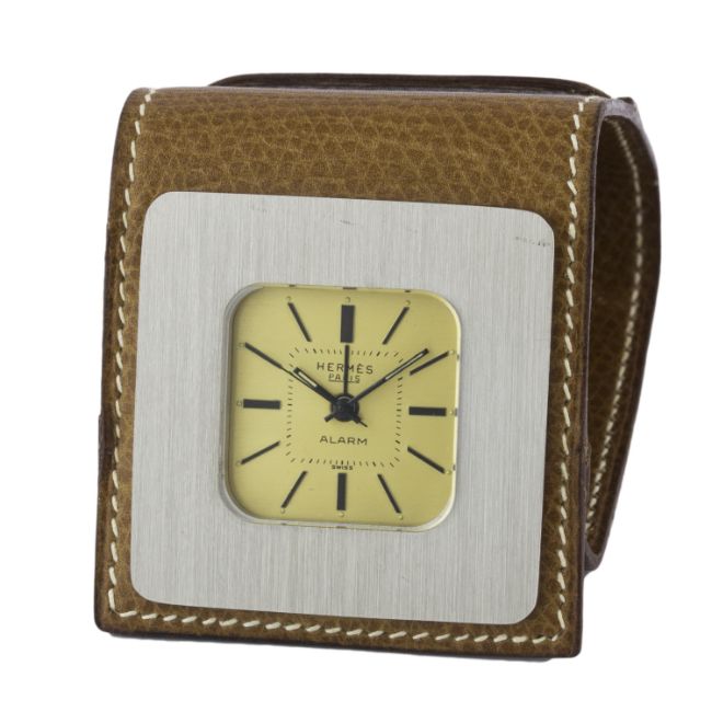 A HERMES PARIS TRAVEL ALARM CLOCK  CIRCA 1970sMovement: Mechanical.Case: Approx. 40mm by 40mm, brushed metal case, brown leather folding cover approx. 47mm by 52mm.    CONDITION REPORTDial: Original dial in excellent condition. Movement: Working at present. Case: In excellent condition, leather showing some small signs of use.
