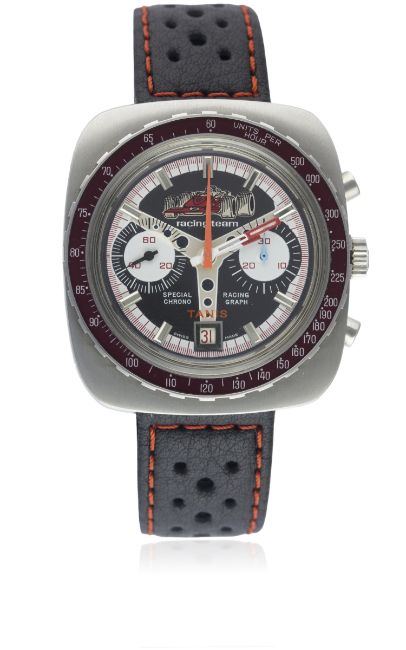 A GENTLEMAN'S STAINLESS STEEL TANIS RACING TEAM SPECIAL RACING CHRONOGRAPH WRIST WATCH CIRCA 1970sMovement: 17J, manual wind, Valjoux cal. 7734.Case: Width approx. 40mm, screw back, signed Tanis Racing Team with Formula 1 car engraved on case back, rotating units per hour bakelite bezel, Tanis crown.Strap: Leather. CONDITION REPORTDial: Original dial in excellent condition.Movement: Working at present.Case: In excellent condition.Strap/Bracelet: In excellent condition.