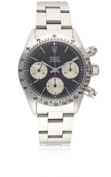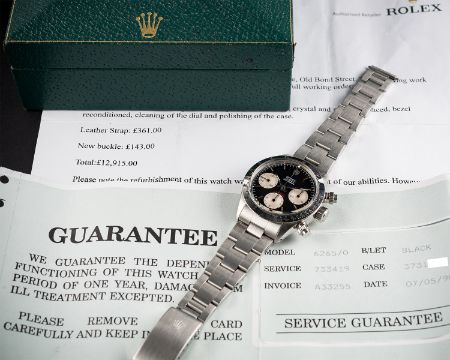 A RARE GENTLEMAN'S STAINLESS STEEL ROLEX OYSTER COSMOGRAPH DAYTONA BRACELET WATCHCIRCA 1973, REF. 6265 WITH "SMALL RED" TRITIUM SERVICE DIAL, ACCOMPANIED BY ORIGINAL BOX AND ROLEX SERVICE RECEIPTS FROM 1998 & DECEMBER 2015 Movement: 17J, manual wind, cal. 727, signed Montres Rolex S.A.Case: Diameter approx. 37mm, Oyster case, signed Montres Rolex S.A., numbered, units per hour bezel, Rolex screw-down crown & pushers.Bracelet: Rolex Oyster bracelet, numbered AD6/78350/19/571. CONDITION REPORTDial: Service dial in excellent condition.Movement: Working at present.Case: In excellent condition.Strap/Bracelet: In excellent condition.