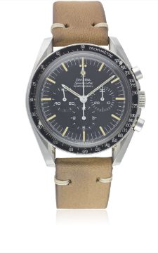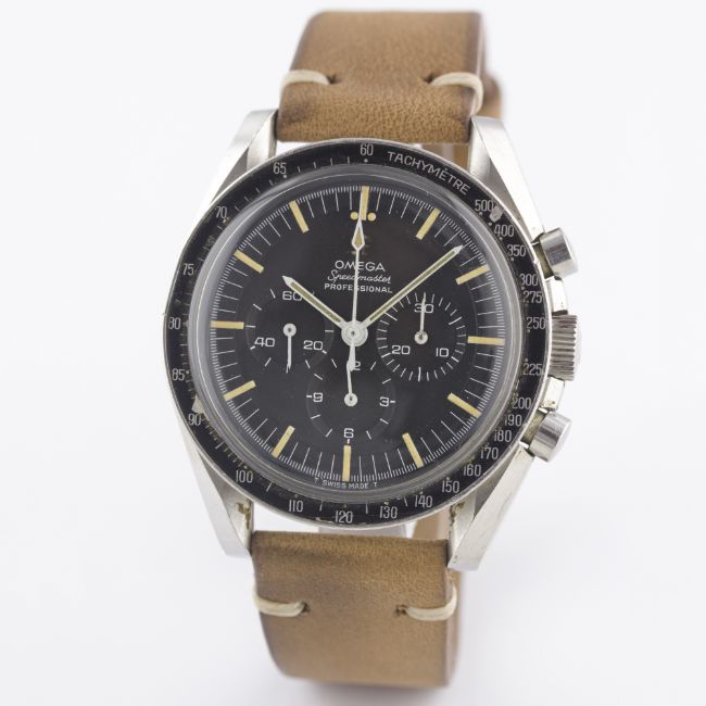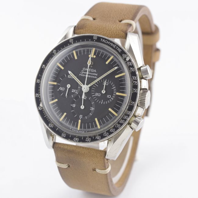 A RARE GENTLEMAN'S STAINLESS STEEL OMEGA SPEEDMASTER PROFESSIONAL CHRONOGRAPH WRIST WATCH CIRCA 1967, REF. 145.012-66 CB CASE Movement: 17J, manual wind, cal. 321, signed Omega Watch Co, numbered. Case: Diameter approx. 42mm, screw back, Speedmaster emblem engraved on case back, signed Omega Watch Co, maker's mark CB, "DON" tachymetre bezel, dust cover, Omega crown.Strap: Leather. CONDITION REPORTDial: Original dial in excellent condition.Movement: Working at present.Case: In very good condition, with some small scratches due to general use.Strap/Bracelet: In excellent condition.