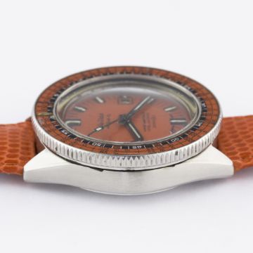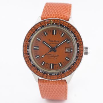 A RARE GENTLEMAN'S STAINLESS STEEL PHILIP HI-SWING CARIBBEAN 1500 1000M AUTOMATIC DIVERS WRIST WATCH CIRCA 1960s, REF. 715 Movement: Automatic, quick-set date. Case: Diameter approx. 42mm, one piece "Triple Safe" case, fish emblem embossed on case back, numbered, decompression table rotating bakelite bezel, mineral crystal, screw-down crown.Strap: Leather. CONDITION REPORTDial: Original dial in excellent condition.Movement: Working at present.Case: In very good condition, some cracks to the bakelite bezel.Strap/Bracelet: In excellent condition.