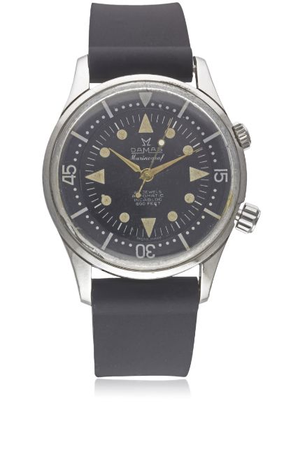 A GENTLEMAN'S STAINLESS STEEL DAMAS MARINOGRAF 600 FEET AUTOMATIC DIVERS WRIST WATCH CIRCA 1961, REF. 3753Movement: 25J, automatic. Case: Diameter approx. 42mm, super compressor, signed Damas with emblem embossed on case back, numbered, dated 9-61.Strap: Rubber.    CONDITION REPORTDial: Original dial in fair condition, showing signs of age. Movement: Working at present. Case: In very good condition, with some light scratches due to general use, markings to case back worn.  Strap/Bracelet: In excellent condition.