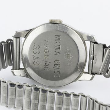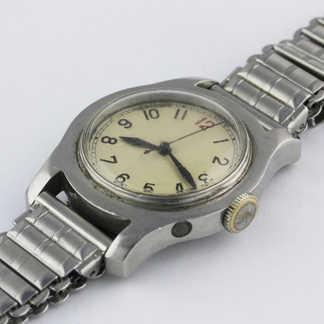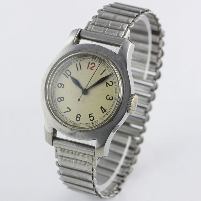 A GENTLEMAN'S STAINLESS STEEL BRITISH MILITARY RAF JAEGER LECOULTRE WEEMS AVIATORS BRACELET WATCH DATED 1940Movement: Manual wind, cal. 450, signed Jaeger-LeCoultre, numbered.Case: Diameter approx. 32mm, snap back, fixed bars, issue markings A.M. Mk VIIA 6B/159 7665/40 .S.S.&S., missing bezel & bezel lock.Bracelet: Bonklip style expanding bracelet. CONDITION REPORTDial: Original dial in fair condition, showing signs of age.Movement: Working at present, slightly loose in case.Case: In fair condition.Strap/Bracelet: In good condition.