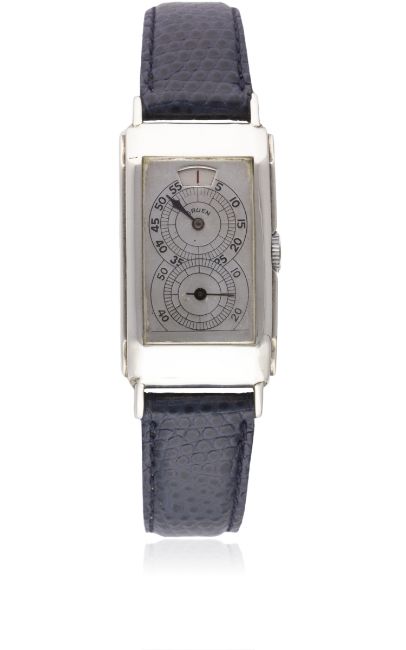 A RARE GENTLEMAN'S SOLID SILVER GRUEN JUMP HOUR "PRINCE" WRIST WATCHCIRCA 1932, WITH "RAILWAY" CASEMovement: 17J, manual wind, signed Gruen Guild A, numbered.Case: Approx. 38mm by 22mm, stepped rectangular case, signed Alpina Gruen, numbered, 0.900 hallmarks, inscription on case back. Strap: Leather. CONDITION REPORTDial: Original dial in good condition, paint has been removed leaving the enamelled tracking & font.Movement: Working at present.Case: In very good condition.Strap/Bracelet: In excellent condition.