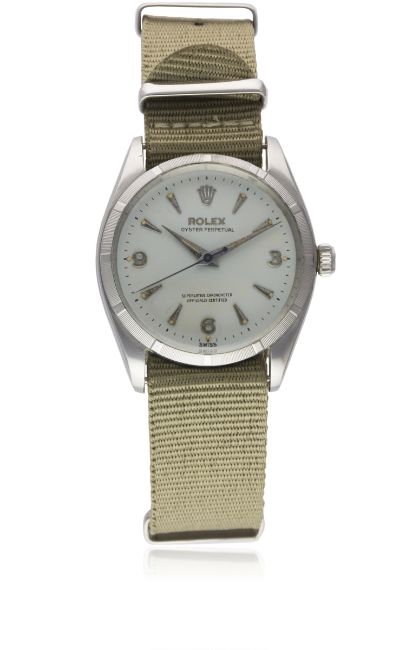 A GENTLEMAN'S STAINLESS STEEL ROLEX OYSTER PERPETUAL WRIST WATCHCIRCA 1960, REF. 1003 WITH 3-6-9 "EXPLORER" DIALMovement: 25J, automatic chronometer, "butterfly" rotor, cal. 1560, signed Montres Rolex S.A., numbered. Case: Diameter approx. 34mm, Oyster case, signed Montres Rolex S.A., dated III.60, numbered, milled bezel, Rolex crown.Strap: NATO. CONDITION REPORTDial: Original dial in excellent condition.Movement: Working at present.Case: In very good condition, with light scratches due to general use.Strap/Bracelet: In excellent condition.