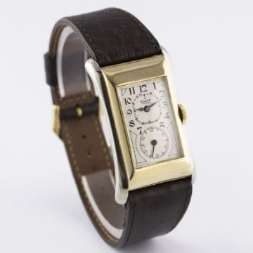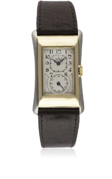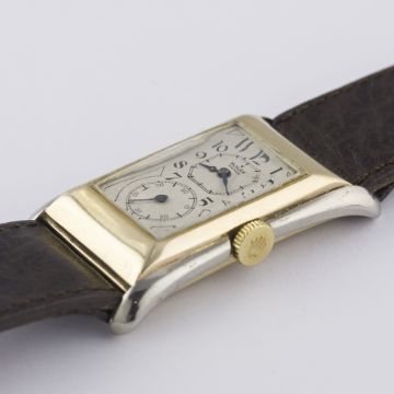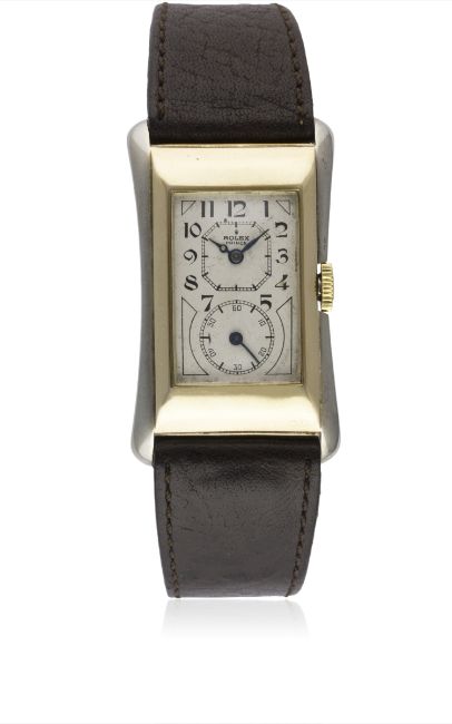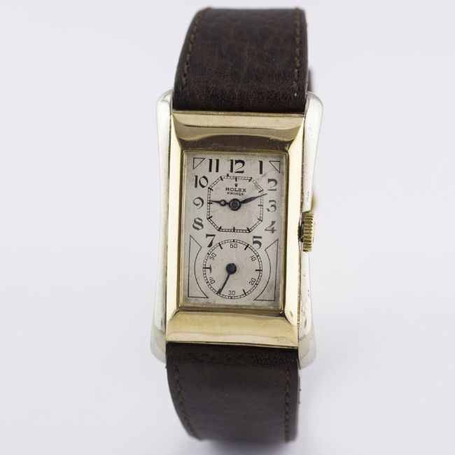 A RARE GENTLEMAN'S 9CT SOLID TWO COLOUR GOLD ROLEX PRINCE BRANCARD WRIST WATCHCIRCA 1930s, REF. 971Movement: 15J, manual wind, signed Rolex Observatory Quality Timed 6 Positions, numbered.Case: Approx. 43mm by 26mm, signed Rolex 25 World's Records, numbered, 9ct hallmarks, presentational inscription on case back, Rolex crown. Strap: Leather. CONDITION REPORTDial: Dial in very good condition, showing some signs of age.Movement: Working at present.Case: In excellent condition, with some light scratches due to general use.Strap/Bracelet: In excellent condition.