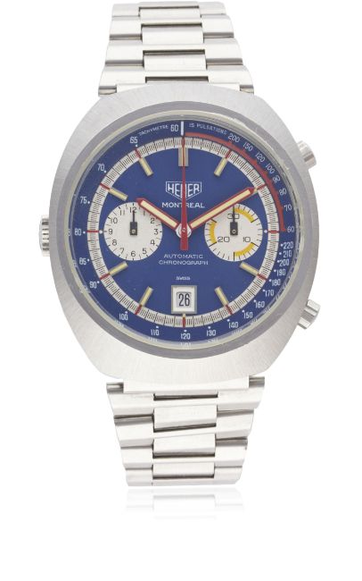 A RARE GENTLEMAN'S STAINLESS STEEL HEUER MONTREAL AUTOMATIC CHRONOGRAPH BRACELET WATCH CIRCA 1970s, REF. 110.503BMovement: 17J, automatic, cal. 12, signed Heuer.Case: Width approx. 42mm, screw back, signed Heuer-Leonidas SA, Heuer crown & pushers.Bracelet: Heuer expanding bracelet. CONDITION REPORTDial: Original dial in excellent condition.Movement: Working at present.Case: In excellent condition.Strap/Bracelet: In excellent condition, with some light scratches due to general use.