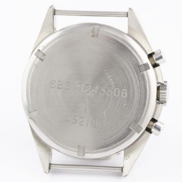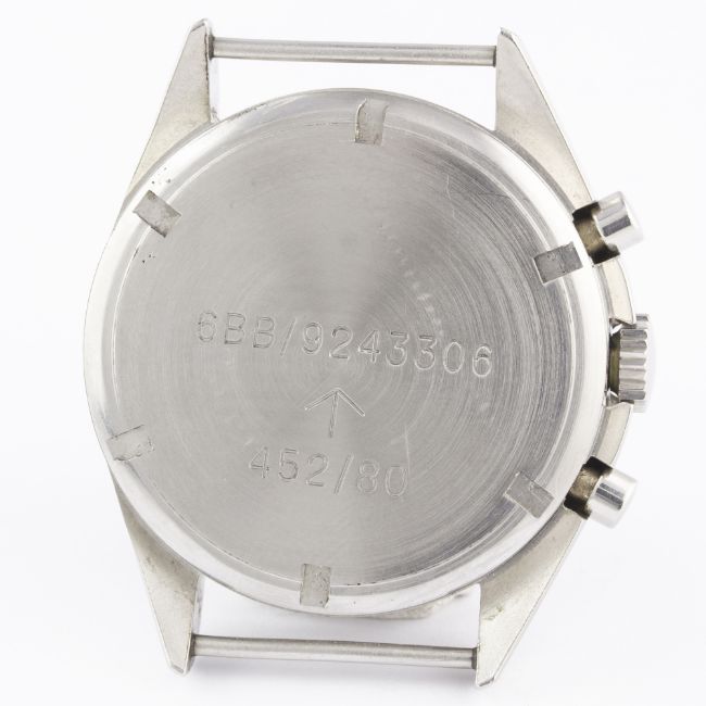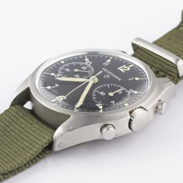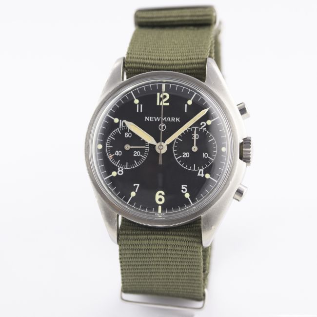 A RARE GENTLEMAN'S STAINLESS STEEL BRITISH MILITARY NEWMARK RAF PILOTS CHRONOGRAPH WRIST WATCH DATED 1980, PART OF THE "FAB FOUR"Movement: 17J, manual wind, Valjoux cal. 7733.Case: Diameter approx. 39mm, screw back, fixed bars, numbered, issue markings 6BB/9243306 ^ 452/80. Strap: NATO.     CONDITION REPORTDial: Original dial in excellent condition. Movement: Working at present. Case: In very good condition, with some small scratches due to use. Strap/Bracelet: In excellent condition.