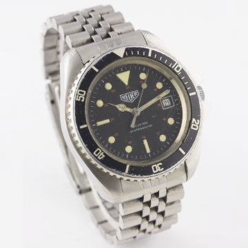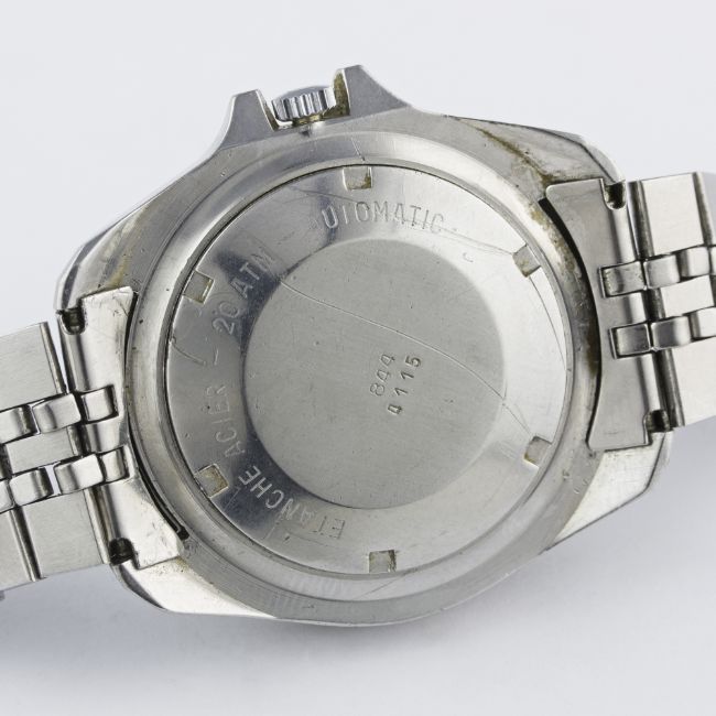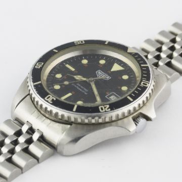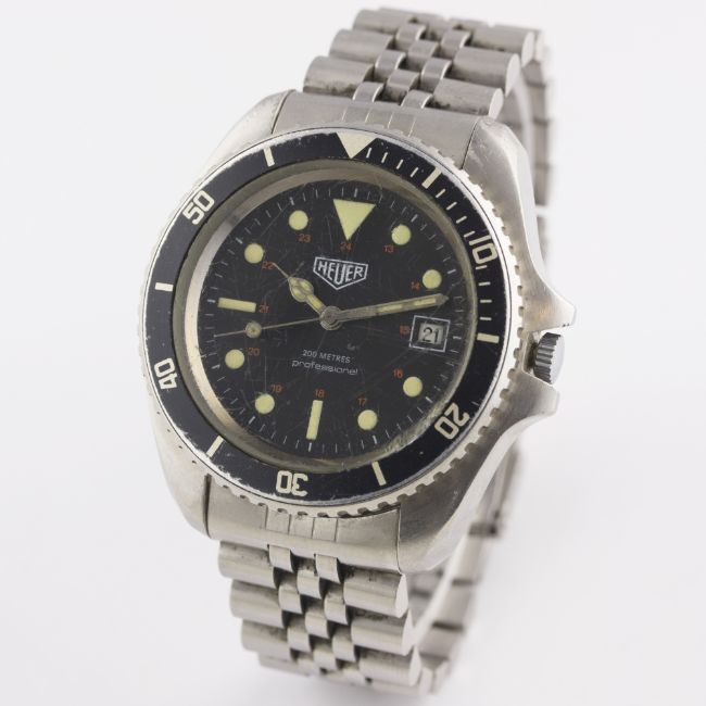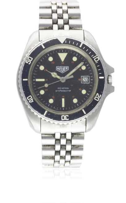 A GENTLEMAN'S STAINLESS STEEL HEUER 200M PROFESSIONAL AUTOMATIC DIVERS BRACELET WATCH CIRCA 1979, REF. 844 FIRST MODEL WITH 24 HOUR DIAL & CATHEDRAL HANDSMovement: Automatic, cal. FE 4611A. Case: Diameter approx. 41mm, screw back, signed M.R.P. S.A., numbered, 60 minute rotating bezel.Bracelet: Original Heuer "Jubliee" bracelet with diver's extension & flip-lock clasp. CONDITION REPORTDial: Original dial in excellent condition, luminous showing a nice patina.Movement: Working at present.Case: In good condition, with scratches due to general use, crystal in poor condition.Strap/Bracelet: In good condition.
