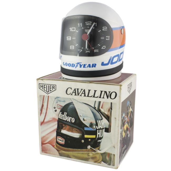 A HEUER CAVALLINO "HELMET" CLOCK CIRCA 1979, THE FORMULA ONE WORLD CHAMPION JODY SCHECKTER EDITION, WITH ORIGINAL BOX Movement: Quartz. Case: Plastic "helmet" case with visor. CONDITION REPORTDial: Original dial in excellent condition.Movement: Working at present.Case: In very good condition, with some light wear due to use.
