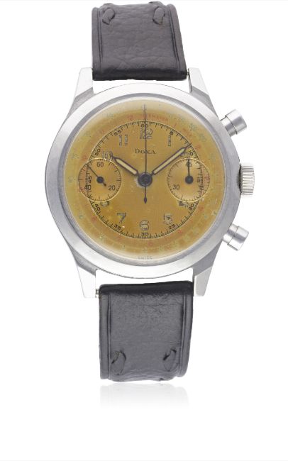 A RARE GENTLEMAN'S LARGE SIZE STAINLESS STEEL DOXA CHRONOGRAPH WRIST WATCHCIRCA 1940s, WITH SPILLMAN CASE & "PUMPKIN PATINA" DIALMovement: 17J, manual wind, base Valjoux 22, Doxa cal. 190, signed Doxa.Case: Diameter approx. 38mm, screw back, signed Doxa S.A., numbered, name inscription on case back, faceted lugs.Strap: Leather. CONDITION REPORTDial: Original dial in good condition, showing a strong dial patina.Movement: Working at present.Case: In excellent condition, with some light scratches due to general use.Strap/Bracelet: In excellent condition.