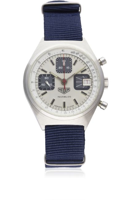 A GENTLEMAN'S STAINLESS STEEL HEUER CHRONOGRAPH WRIST WATCH CIRCA 1980Movement: 17J, manual wind, Valjoux cal. 7765, signed Heuer.Case: Width approx. 38mm, screw back, signed G. Monnin France, numbered, Heuer crown.Strap: NATO. CONDITION REPORTDial: Original dial in excellent condition.Movement: Working at present.Case: In excellent condition, with some small scratches due to general use.Strap/Bracelet: In excellent condition.