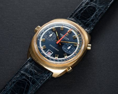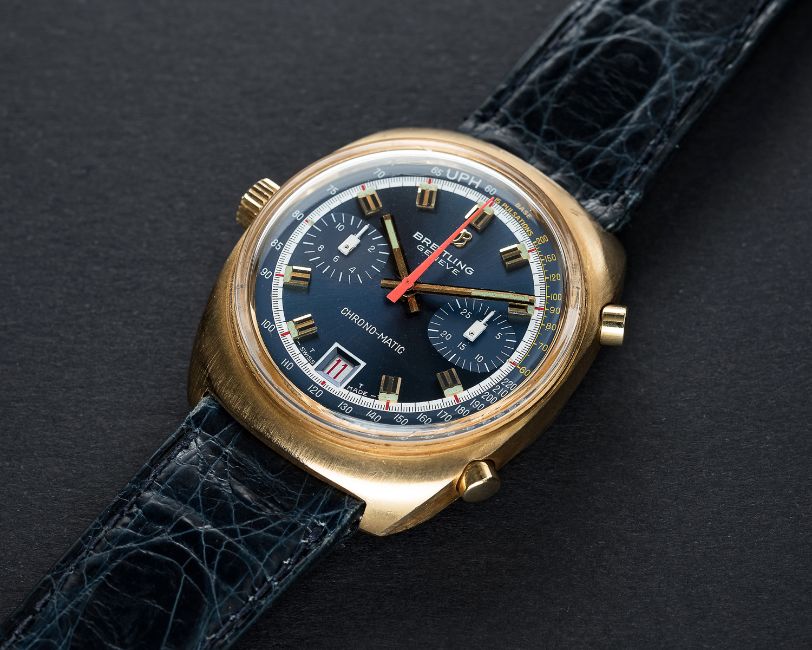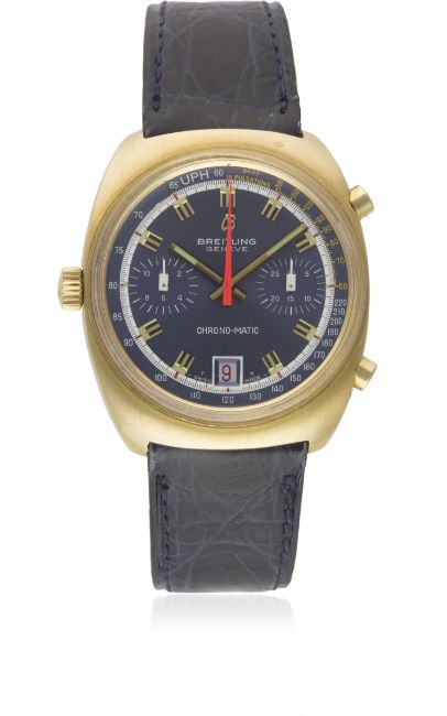 A RARE GENTLEMAN'S 18K SOLID GOLD BREITLING CHRONO MATIC CHRONOGRAPH WRIST WATCH CIRCA 1972, REF. 2118Movement: 17J, automatic, cal. 12, signed Breitling.Case: Width approx. 36mm, snap back, signed Breitling Watch Ltd, numbered, 18k hallmarks, Breitling crown & pushers.Strap: Leather. CONDITION REPORTDial: Original dial in excellent condition.Movement: Working at present.Case: In excellent condition, with some small scratches due to general use.Strap/Bracelet: In good condition.