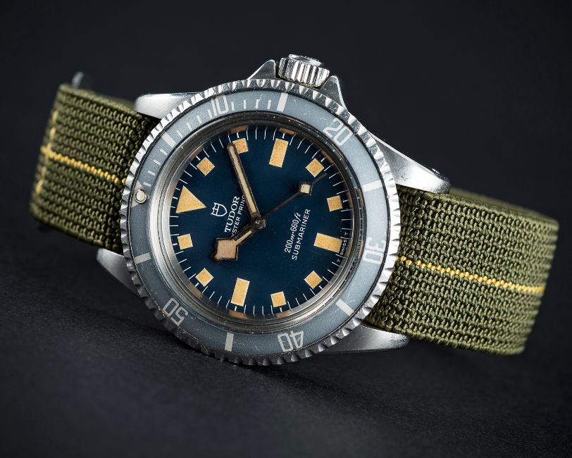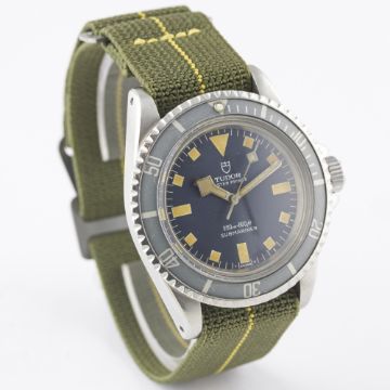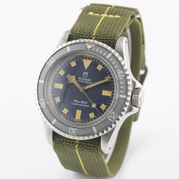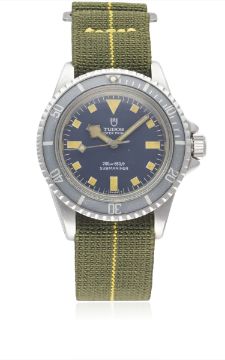 AN EXTREMELY RARE GENTLEMAN'S STAINLESS STEEL FRENCH MILITARY MARINE NATIONALE ROLEX TUDOR OYSTER PRINCE "SNOWFLAKE" SUBMARINER WRIST WATCHDATED 1977, REF. 94010 Movement: 25J, automatic, signed Tudor Auto-Prince.Case: Diameter approx. 40mm, Oyster case, signed Montres Tudor S.A., numbered, marked M.N. 77, 60 minute rotating bezel, Rolex triplock crown.Strap: M.N. style strap. CONDITION REPORTDial: Original dial in excellent condition.Movement: Working at present.Case: In excellent condition, with some scratches due to use, bezel insert nicely faded.Strap/Bracelet: In excellent condition.