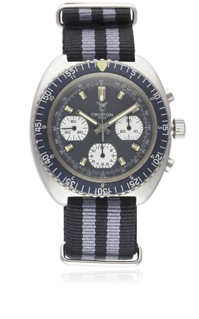A GENTLEMAN'S STAINLESS STEEL CROTON DIVERS CHRONOGRAPH WRIST WATCH CIRCA 1970Movement: 17J, manual wind, Valjoux cal. 7736, signed Croton Time Corp.Case: Width approx. 43mm, screw back, scuba diving figure embossed on case back, signed Croton Watch Co Inc, MH rotating bezel faded to blue/grey, screw-down crown.Strap: NATO. CONDITION REPORTDial: Original dial in excellent condition.Movement: Working at present.Case: In very good condition, with some small scratches due to general use.Strap/Bracelet: In excellent condition.