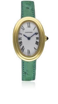 A LADIES 18K SOLID GOLD CARTIER BAIGNOIRE WRIST WATCHCIRCA 1990Movement: Manual wind, signed Cartier.Case: Approx. 31mm by 23mm, signed Cartier Paris, numbered, 18k hallmarks, sapphire crown. Strap: Leather strap with gilt metal Cartier pin buckle. CONDITION REPORTDial: Original dial in excellent condition.Movement: Working at present.Case: In excellent condition, with some light scratches due to general use, crystal fairly scratched.Strap/Bracelet: In excellent condition.