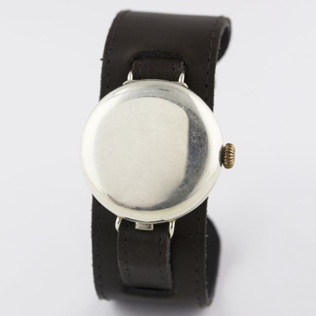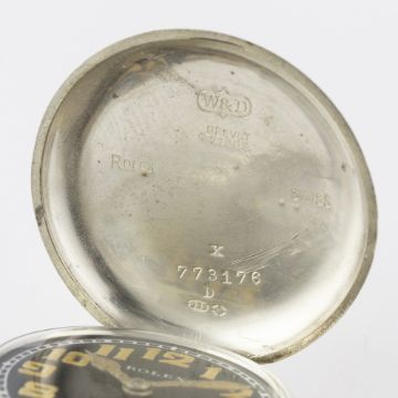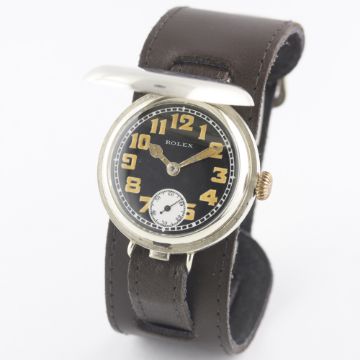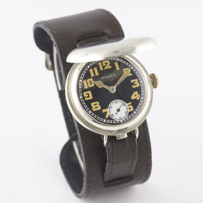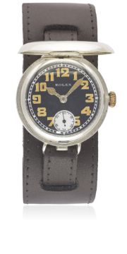 A RARE GENTLEMAN'S SOLID SILVER ROLEX FULL HUNTER OFFICERS TRENCH WRIST WATCH CIRCA 1916, WITH BLACK & WHITE ENAMEL DIALMovement: 15J, manual wind, signed Rolex.Case: Diameter approx. 35mm, screw back, signed Rolex W&D, numbered, silver hallmarks. Strap: Leather. CONDITION REPORTDial: Original dial in excellent condition.Movement: Working at present.Case: In excellent condition, with some light scratches due to general use.Strap/Bracelet: In excellent condition.