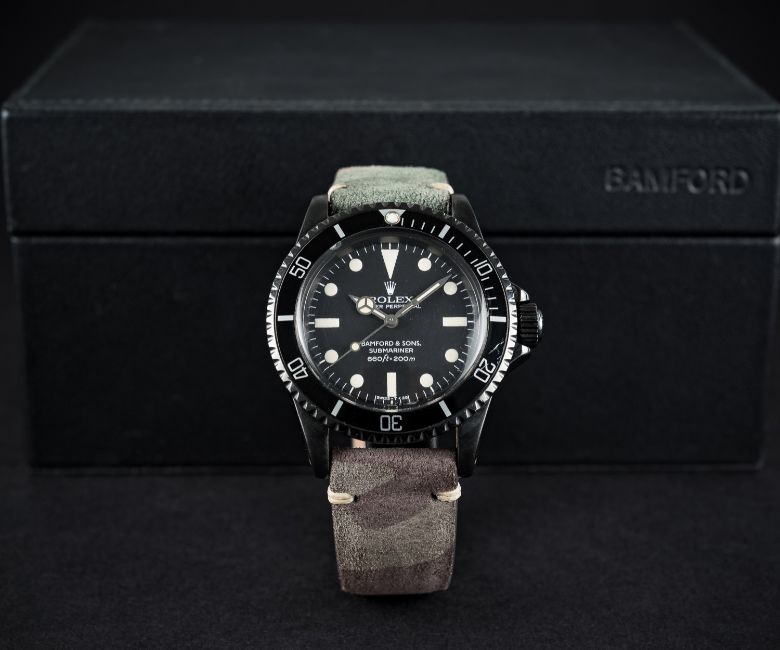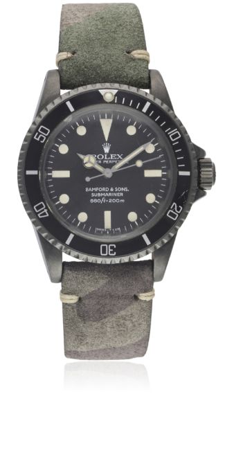 A RARE GENTLEMAN'S DARK GREY DLC COATED STAINLESS STEEL BAMFORD & SONS ROLEX OYSTER PERPETUAL SUBMARINER WRIST WATCHCIRCA 1978, REF. 5513 WITH MK II "MAXI" DIAL, CUSTOMISED BY BAMFORD & SONS IN 2004 (NOW BAMFORD WATCH DEPARTMENT), ACCOMPANIED BY ORIGINAL BAMFORD BOX Movement: 26J, automatic, cal. 1520, signed Rolex Geneva.Case: Diameter approx. 40mm, Oyster case, signed Montres Rolex S.A., numbered, signed Bamford & Sons on case back, 60 minute rotating bezel, Rolex triplock crown.Strap: Camo suede. CONDITION REPORTDial: Original dial in excellent condition.Movement: Working at present.Case: In excellent condition, with some light scratches due to general use.Strap/Bracelet: In excellent condition.