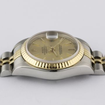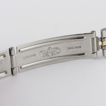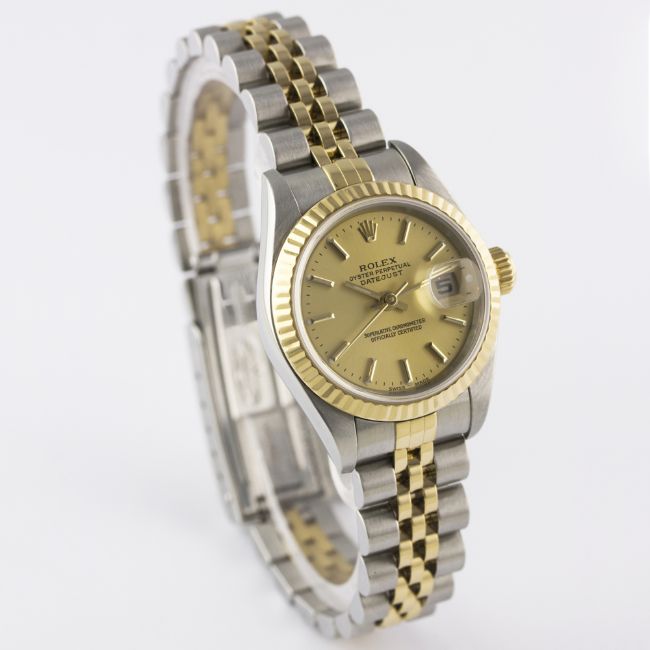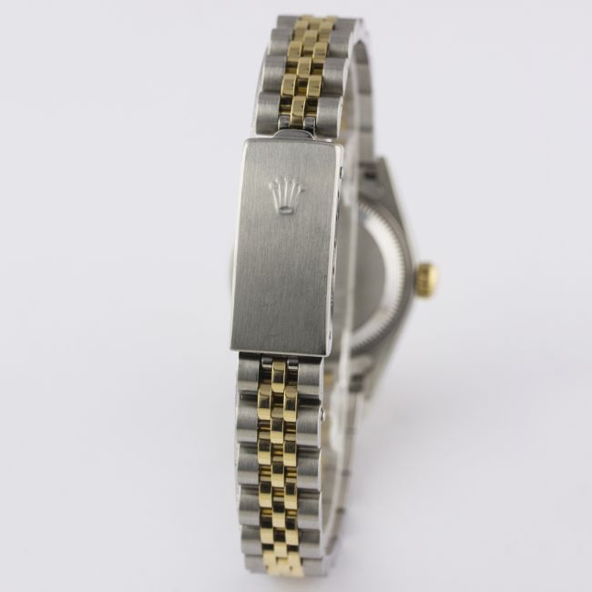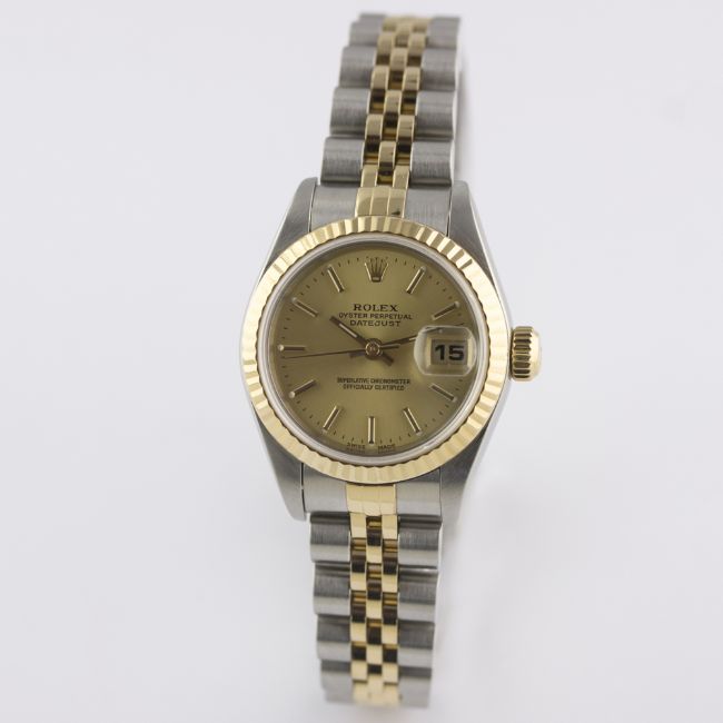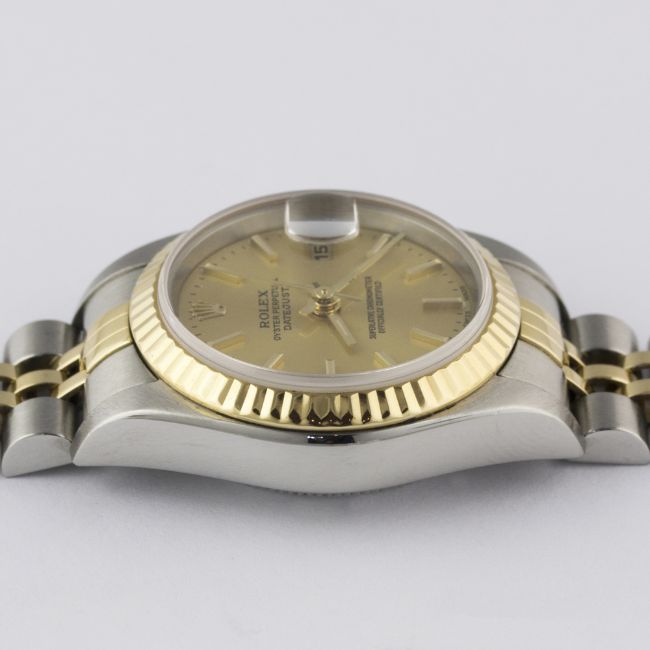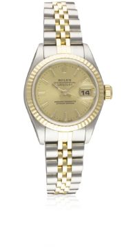 A LADIES STEEL & GOLD ROLEX OYSTER PERPETUAL DATEJUST BRACELET WATCHDATED 2004, REF. 79173 WITH BOX & PAPERSMovement: 31J, automatic chronometer, cal. 2235, signed Rolex S.A. Geneve, numbered.Case: Diameter approx. 26mm, Oyster case, signed Montres Rolex S.A., numbered, solid gold fluted bezel, sapphire crystal, Rolex crown.Bracelet: Original Rolex Jubilee steel & solid gold bracelet, numbered AD1/62523 D-18/468B. CONDITION REPORTDial: Original dial in excellent condition.Movement: Working at present.Case: In excellent condition, with some very light scratches due to general use.Strap/Bracelet: In excellent condition with some very light scratches due to general use.