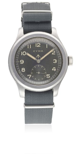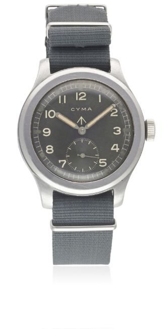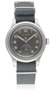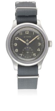 A GENTLEMAN'S STAINLESS STEEL BRITISH MILITARY CYMA W.W.W. WRIST WATCH CIRCA 1940s, PART OF THE "DIRTY DOZEN"Movement: 15J, manual wind, cal. 234, signed Cyma, numbered.Case: Diameter approx. 38mm, fixed bars, screw back, issue markings ^ W.W.W. P9854 14854, dust cover.Strap: NATO. CONDITION REPORTDial: Original dial in excellent condition, luminous showing some patina.Movement: Working at present.Case: In excellent condition, with some scratches to the case back.Strap/Bracelet: In very good condition.