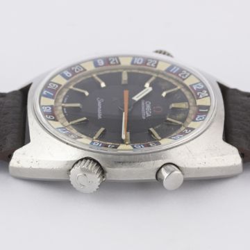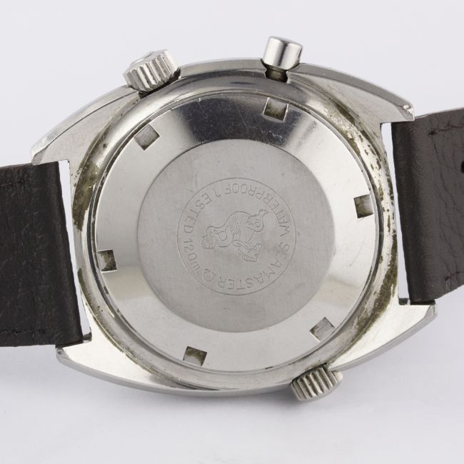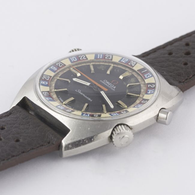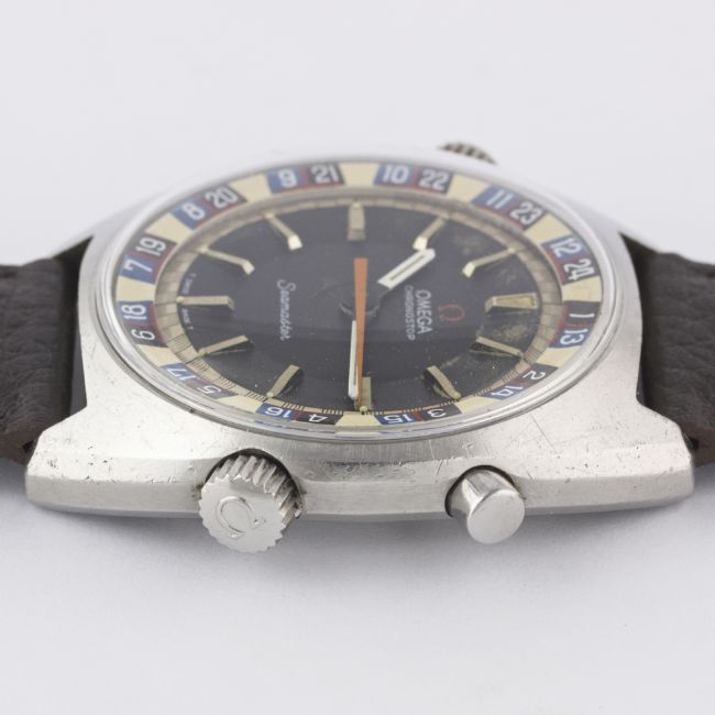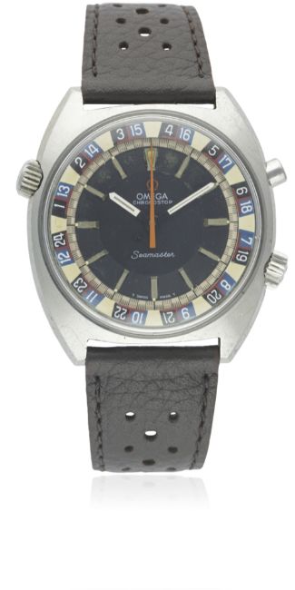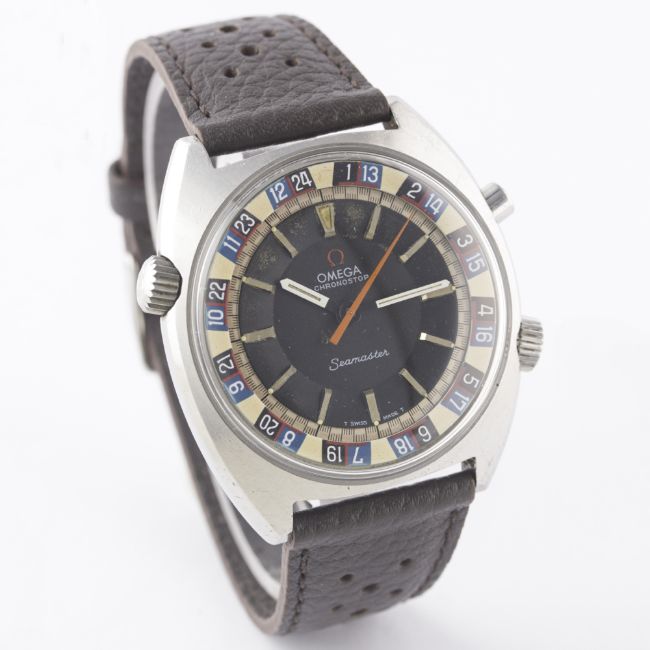 A GENTLEMAN'S LARGE SIZE STAINLESS STEEL OMEGA SEAMASTER CHRONOSTOP WRIST WATCH CIRCA 1969, REF. 145.008 WITH "ROULETTE" INNER BEZELMovement: 17J, manual wind, cal. 865, signed Omega, numbered. Case: Width approx. 41mm, screw back, Seamaster emblem engraved on case back, signed Omega Watch Co, 24 hour dual time inner rotating bezel, Omega crowns.Strap: Perforated leather. CONDITION REPORTDial: Original dial in good condition, showing some signs of age.Movement: Working at present.Case: In very good condition, with scratches due to general use.Strap/Bracelet: In excellent condition.