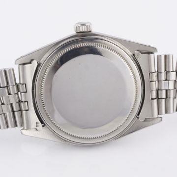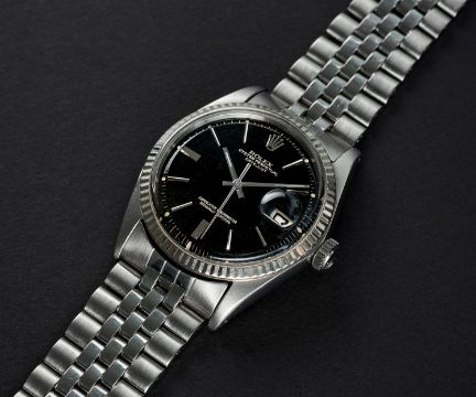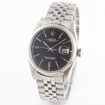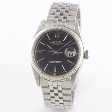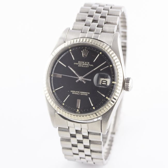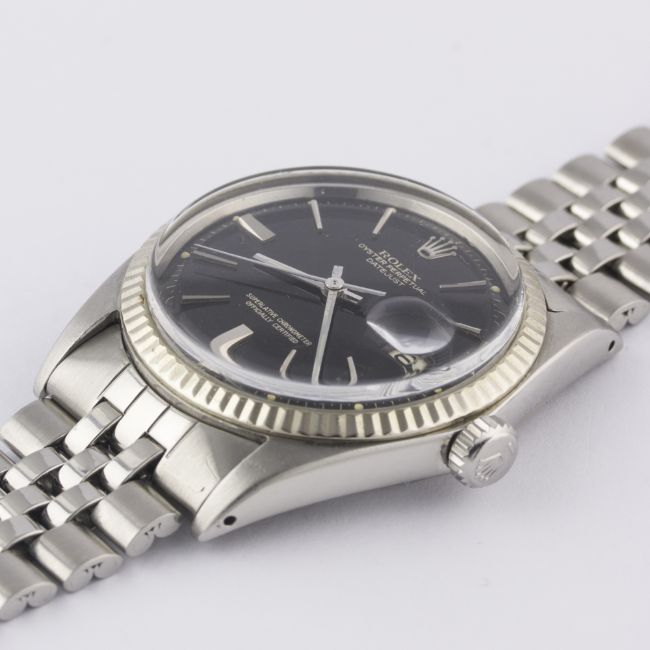 A RARE GENTLEMAN'S STEEL & WHITE GOLD ROLEX OYSTER PERPETUAL DATEJUST BRACELET WATCHCIRCA 1965, REF. 1601 WITH GLOSS BLACK DIALMovement: 26J, automatic chronometer, cal. 1560, signed Montres Rolex S.A., numbered.Case: Diameter approx. 36mm, Oyster case, signed Montres Rolex S.A., dated I.65, numbered, solid white gold fluted bezel, Rolex crown.Bracelet: Rolex Jubilee bracelet numbered 6251H/55, dated 2.71. CONDITION REPORTDial: Original dial in excellent condition, showing some very small signs of age.Movement: Working at present.Case: In excellent condition, with some small scratches due to general use.Strap/Bracelet: In excellent condition, with light scratches.