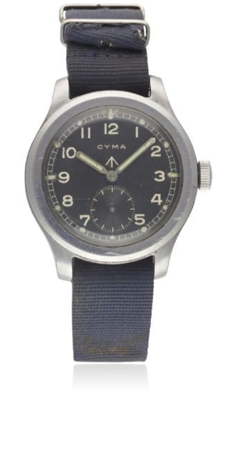A GENTLEMAN'S STAINLESS STEEL BRITISH MILITARY CYMA W.W.W. WRIST WATCH CIRCA 1940s, PART OF THE "DIRTY DOZEN"Movement: 15J, manual wind, cal. 234, signed Cyma, numbered.Case: Diameter approx. 38mm, fixed bars, screw back, issue markings ^ W.W.W. P26959 31959.Strap: NATO. CONDITION REPORTDial: Original dial in excellent condition, showing some small signs of age.Movement: Working at present.Case: In excellent condition, with scratches due to use.Strap/Bracelet: In poor condition.