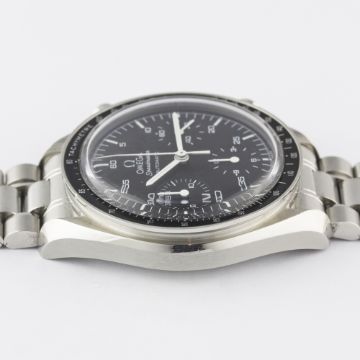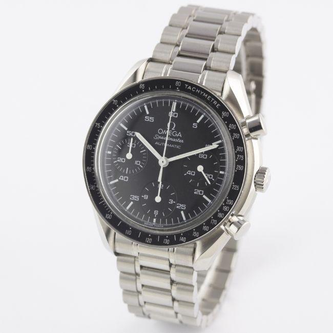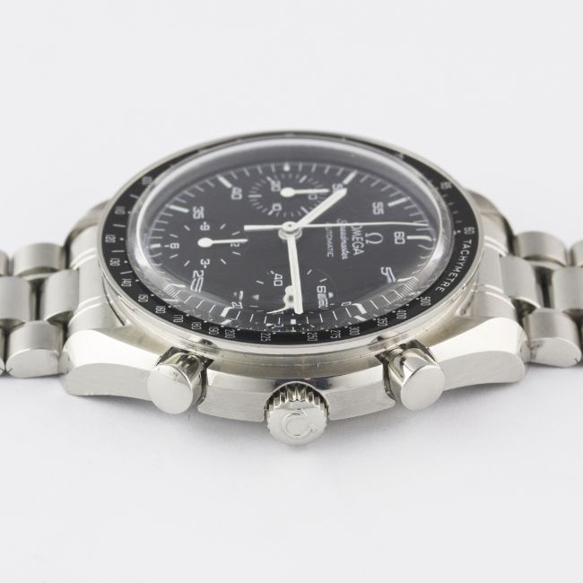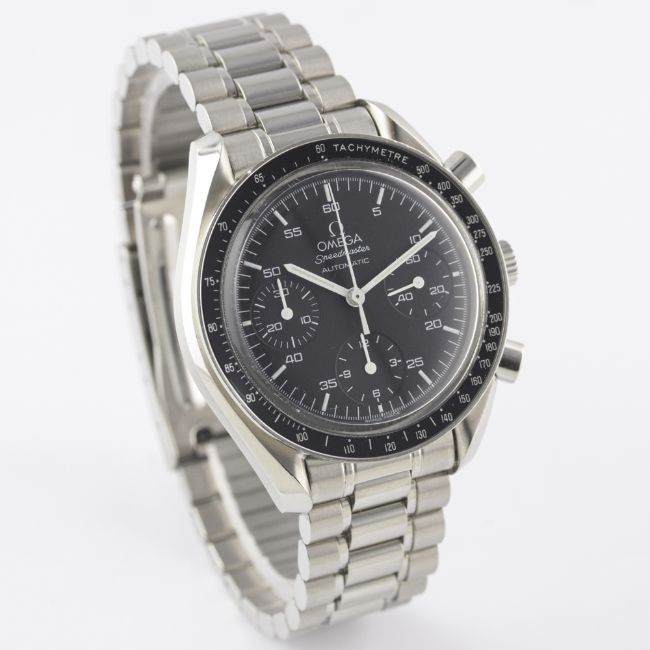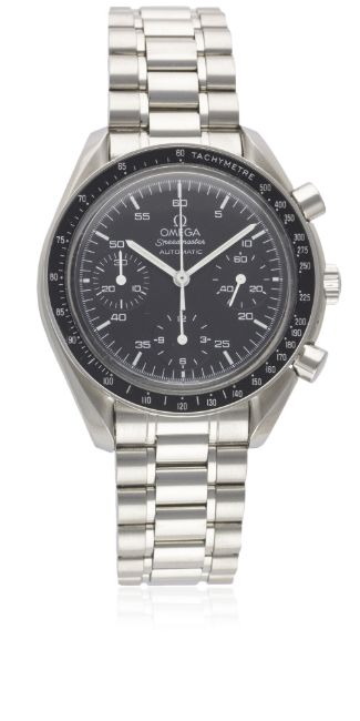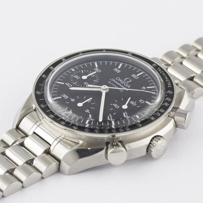 A GENTLEMAN'S STAINLESS STEEL OMEGA SPEEDMASTER AUTOMATIC CHRONOGRAPH BRACELET WATCH CIRCA 2008Movement: Automatic, signed Omega, numbered. Case: Diameter approx. 39mm, snap back, Speedmaster emblem embossed on case back, signed Omega, numbered, tachymetre bezel, Omega crown.Bracelet: Original Omega Speedmaster bracelet. CONDITION REPORTDial: Original dial in excellent condition.Movement: Working at present.Case: In excellent condition, with some light scratches due to general use.Strap/Bracelet: In excellent condition, with some light scratches due to general use.