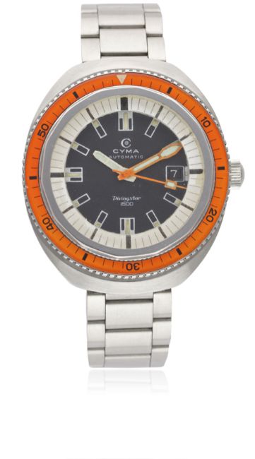 A RARE GENTLEMAN'S STAINLESS STEEL CYMA DIVINGSTAR 1500 DIVERS BRACELET WATCH CIRCA 1970, WITH "SERPENT" HANDS Movement: 21J, automatic, signed Synchron Cyma 55. Case: Width approx. 43mm, screw back, signed Cyma Watch Co, logo embossed on case back, numbered, orange bakelite 60 minute rotating bezel, screw-down crown.Bracelet: Non-original. CONDITION REPORTDial: Original dial in good condition, showing signs of age, inner bezel showing some wear.Movement: Working at present.Case: In excellent condition, with some light scratches due to general use, bezel free of cracks.Strap/Bracelet: In excellent condition, with some light scratches due to general use.