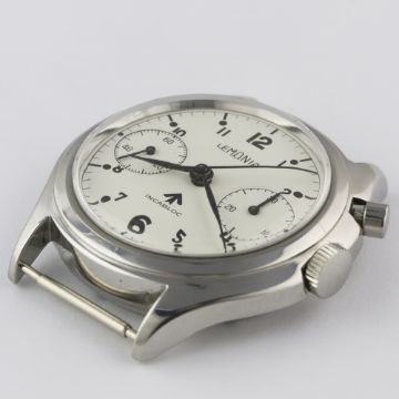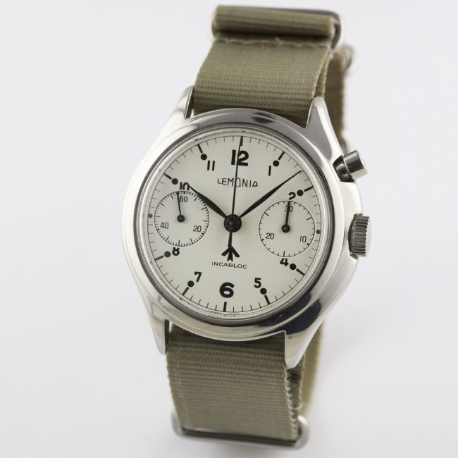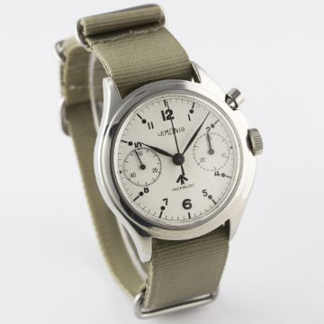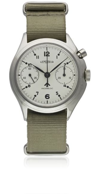 A VERY RARE GENTLEMAN'S STAINLESS STEEL BRITISH MILITARY LEMANIA SINGLE BUTTON ROYAL NAVY NUCLEAR SUBMARINE CHRONOGRAPH WRIST WATCH CIRCA 1960s Movement: Manual wind, non-incabloc.Case: Diameter approx. 40mm, asymmetric, screw back, numbered, issue markings ^ 0552/924-3312 768 (3306 crossed out). Strap: NATO. These watches were issued to nuclear submarine crew members. The dials & hands were produced without luminous material so therefore could not interfere with radiation detectors onboard (giving false positive readings). CONDITION REPORTDial: Original dial in excellent condition.Movement: Working at present.Case: In excellent condition, with light scratches due to use.Strap/Bracelet: In very good condition.