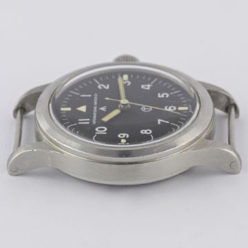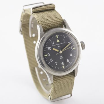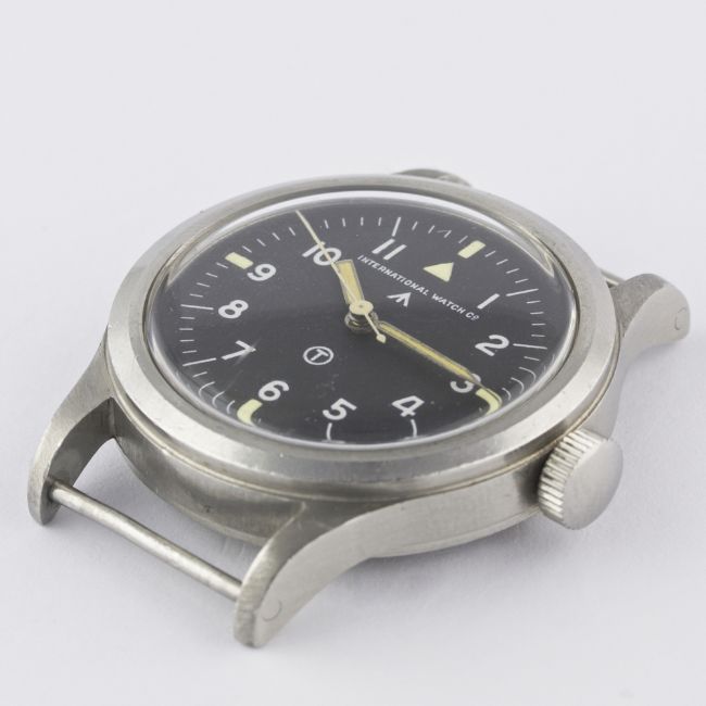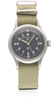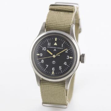 A RARE GENTLEMAN'S STAINLESS STEEL BRITISH MILITARY IWC MARK 11 RAF PILOTS WRIST WATCH DATED 1950Movement: Manual wind, hacking seconds, cal. 89, signed International Watch Co with military arrow, numbered.Case: Diameter approx. 36mm, fixed bars, screw back, signed International Watch Co, issue markings ^ 6B/346 124/50, anti-magnetic dust cover.Strap: NATO. CONDITION REPORTDial: Original MOD dial in excellent condition.Movement: Working at present.Case: In very good condition, with some small scratches due to use.Strap/Bracelet: In excellent condition.