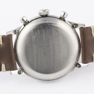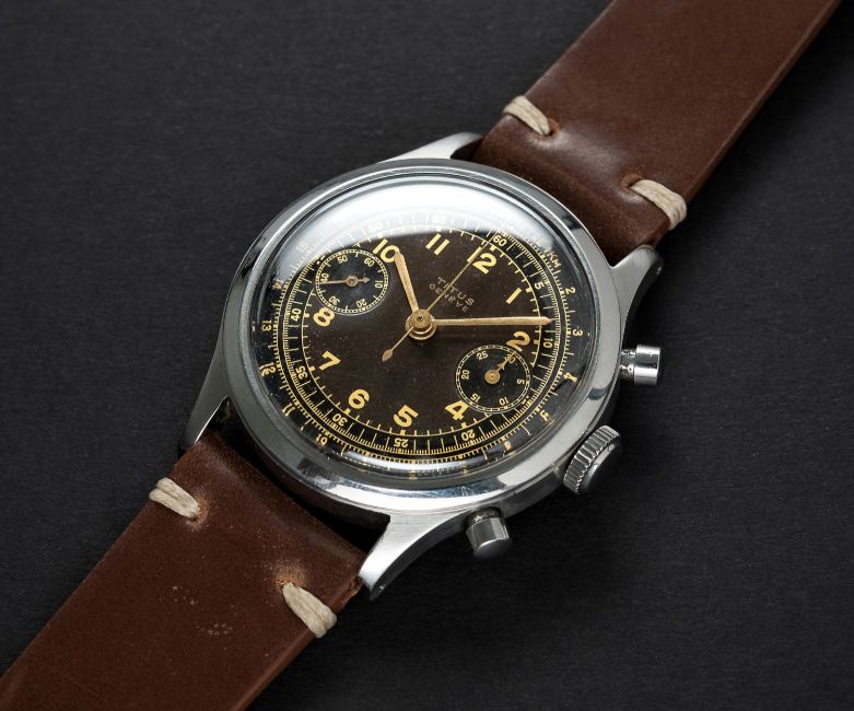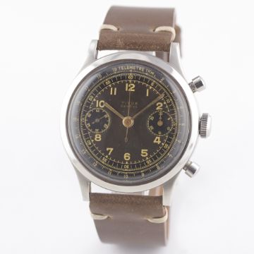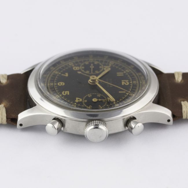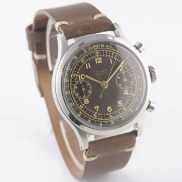 A VERY RARE GENTLEMAN'S LARGE SIZE STAINLESS STEEL TITUS "CLAMSHELL" CHRONOGRAPH WRIST WATCH CIRCA 1940s, WITH GLOSS BLACK GILT DIAL TURNING BROWNMovement: 17J, manual wind, Valjoux cal. 22. Case: Diameter approx. 38mm, "clamshell", numbered.Strap: Leather.    CONDITION REPORTDial: Original dial in excellent condition. Movement: Working at present. Case: In excellent condition, with some light scratches due to general use. Strap/Bracelet: In excellent condition.